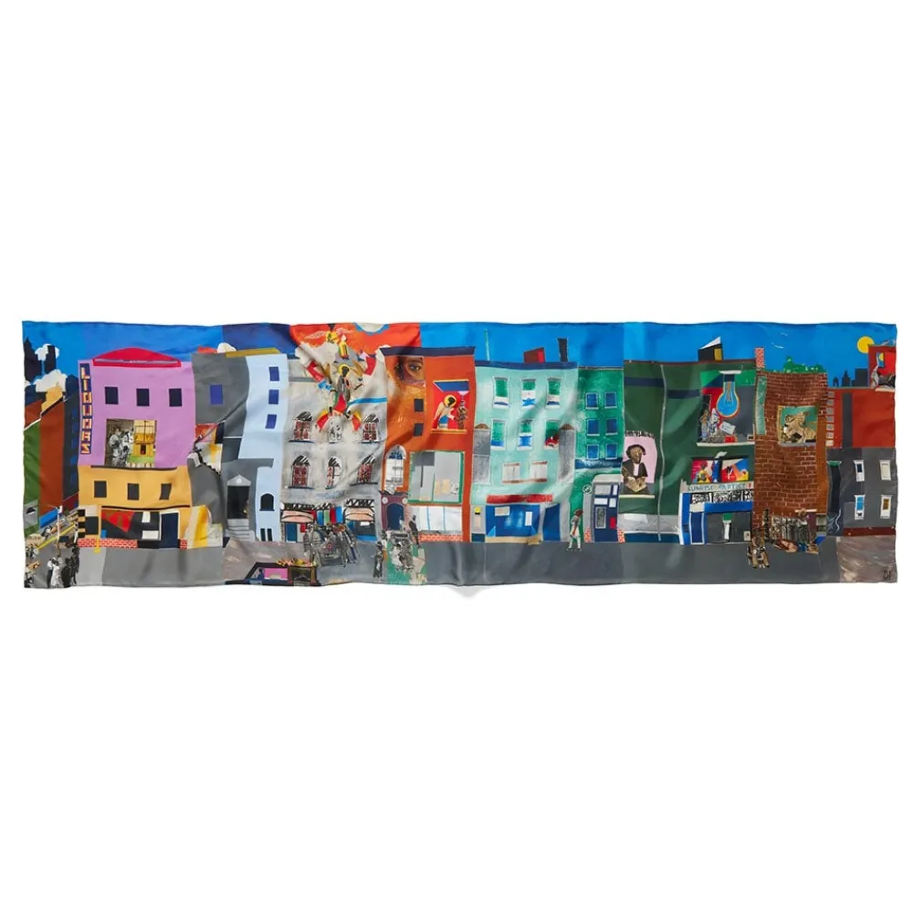 Romare Bearden’s (American, 1911–1988) exuberant tribute to Harlem is a celebration of the lively New York City neighborhood that nurtured his life and work. Though he was born in North Carolina, Bearden spent formative time in Harlem as a child, and in 1940, he established a studio in the same West 125th Street building as the artist Jacob Lawrence. Each of the six panels that make up The Block (1971), reproduced on this 100% silk-twill scarf with a hand-rolled hem, represents an aspect of local life, from the barbershop to the corner store.