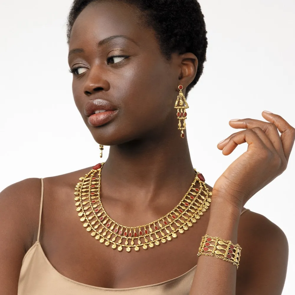 This handcrafted bracelet evokes a splendid Egyptian collar (ca. 1504–1450 BCE) of amulets featuring the “nefer” hieroglyph, which signifies a word meaning “good” or “beautiful.” The auspicious symbolism of the Museum’s adornment suggests that it may have been made to bring good fortune to the wearer—in this case, a wife of the pharaoh Thutmose III. Our contemporary visions of this outstanding broad collar are both eye-catching and lightweight for an effortless statement.